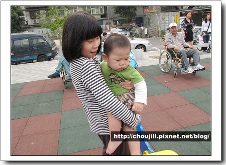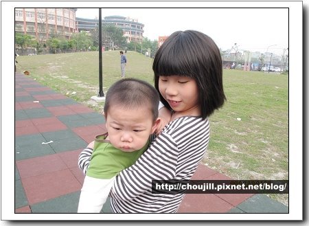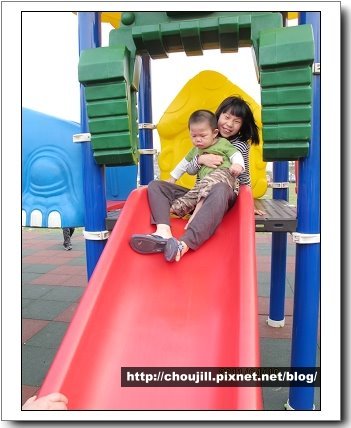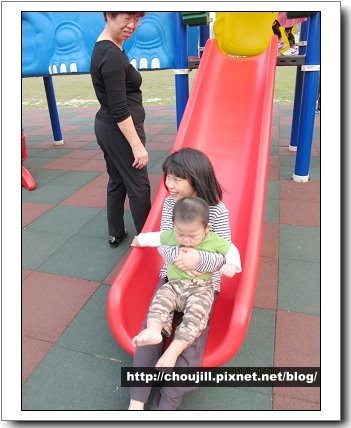 姊姊就這麼抱著丁丁爬樓梯溜滑梯